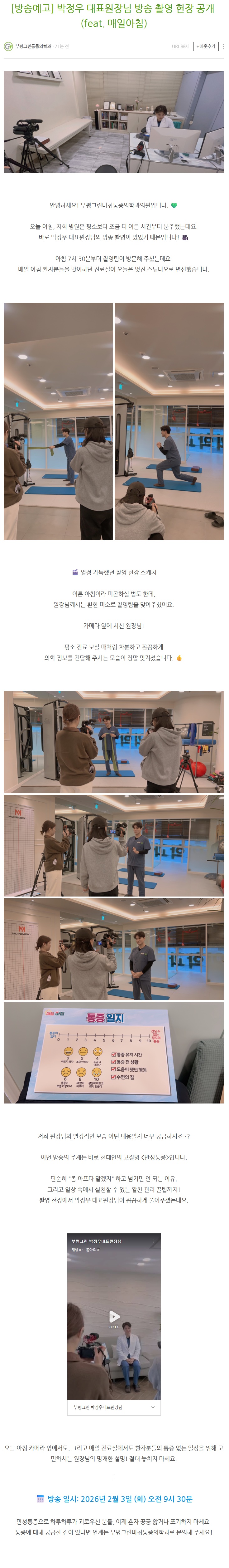 [방송예고] 박정우 대표원장님 방송 촬영 현장 공개 (feat. 매일아침) [출처] [방송예고] 박정우 대표원장님 방송 촬영 현장 공개 (feat. 매일아침)|작성자 부평그린통증의학과